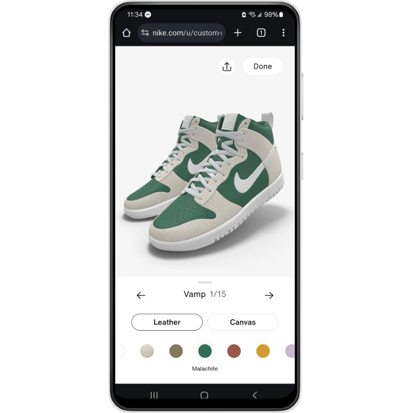 Nike By You enables color and materials customization of its branded shoes through a guided sequence.