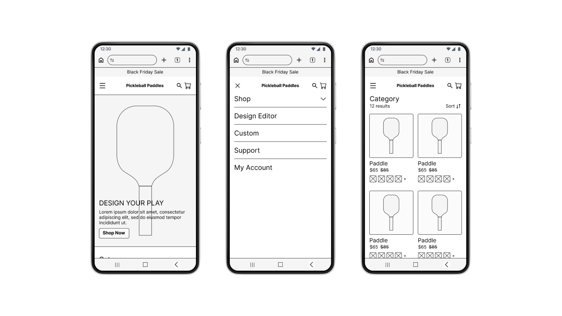 I evaluated e-commerce platforms which sell pickleball paddles or which include customization tools. While competitors shared similar ways to browse and purchase paddles, there were few tools to customize paddles, revealing an untapped opportunity.