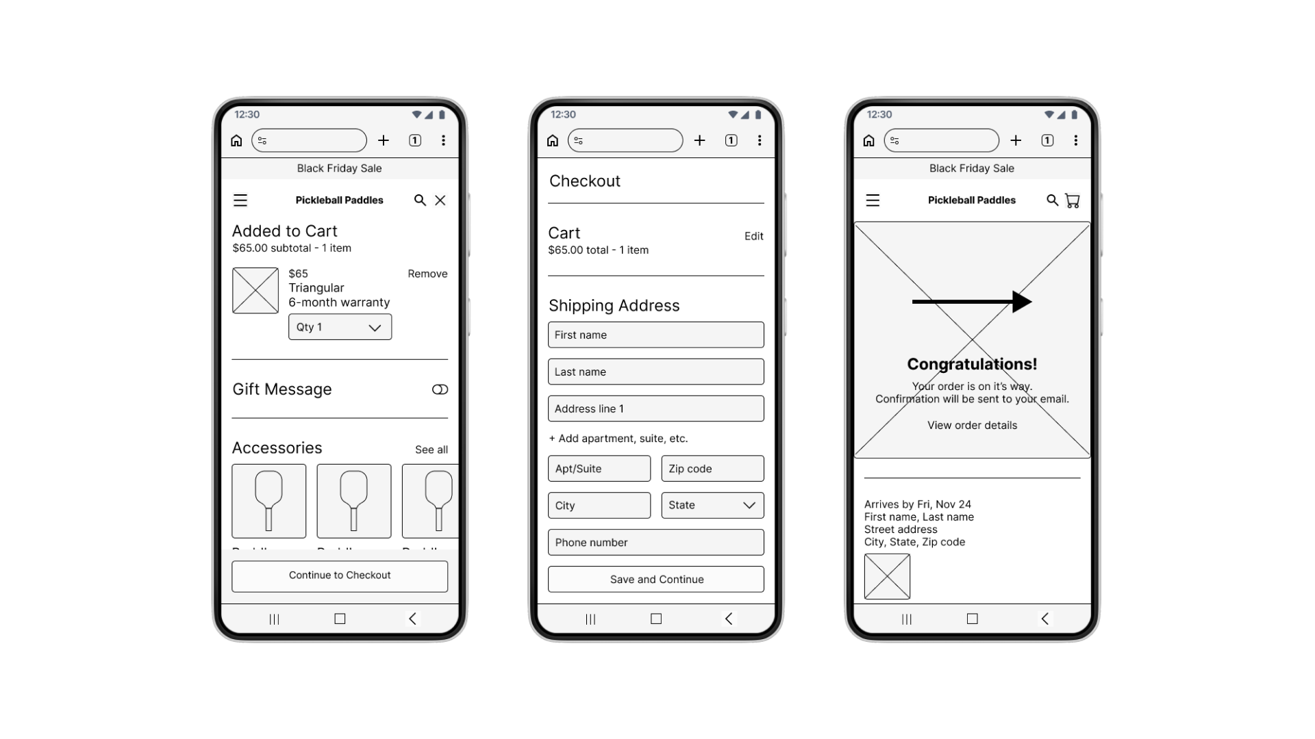 I crafted initial low-fidelity designs by closely referencing the platforms from the competitive audit. I incorporated familiar e-commerce elements such as pages for product listings, product details, and checking out. Unclear on what kind of customization tool users would prefer, I sketched a free-form option with many features for participants to test.