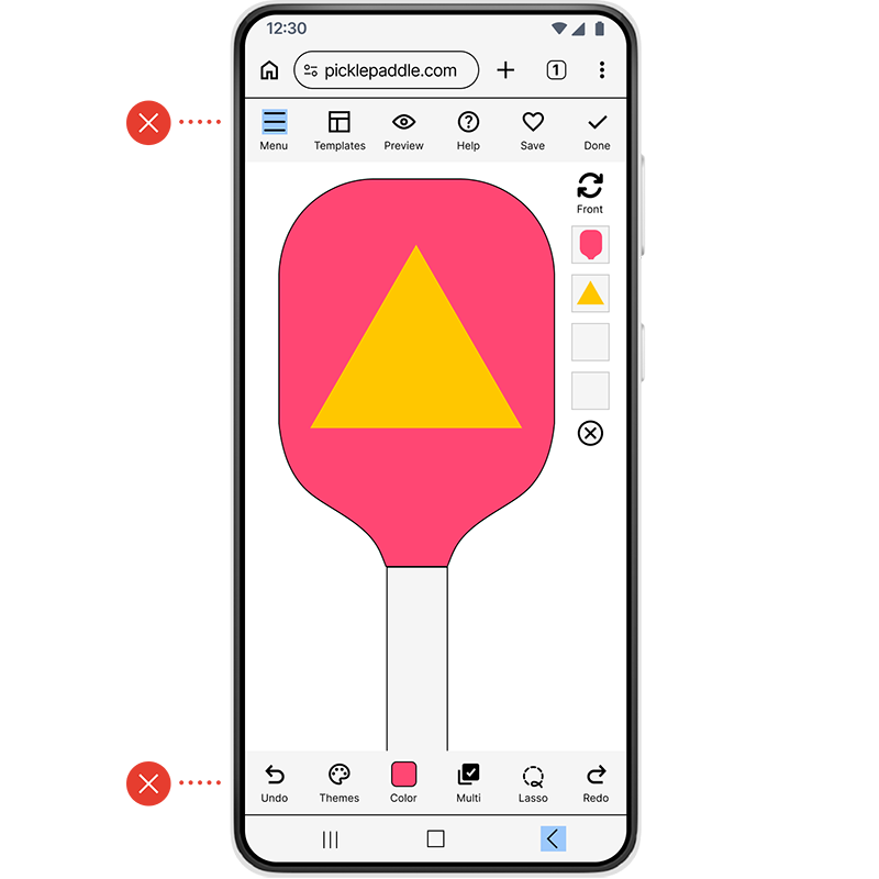 The layout is simplified to a single row of swatches at the bottom. Users can switch between the paddle’s front and back by clicking on them.