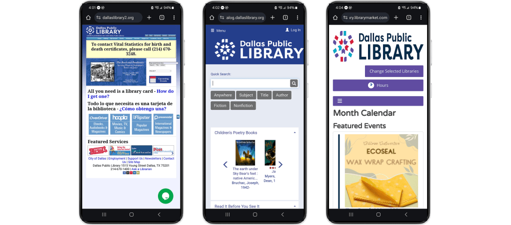 The Dallas Public Library website connects visitors to a wealth of services, from borrowing books to free online courses. The website also informs visitors about upcoming events at the libraries, like family activities, financial planning, and voting.
