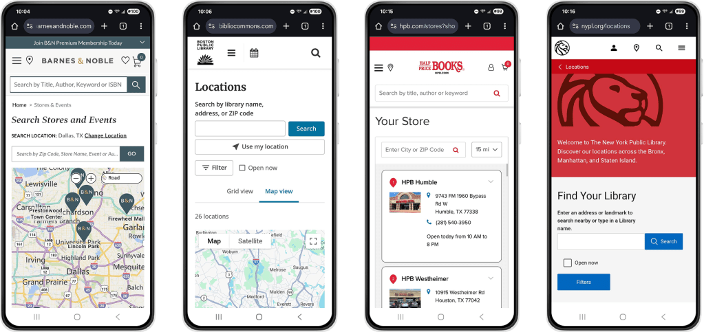 To explore possible solutions, I evaluated other library/bookseller websites in a comparative audit. They share common elements, such as a navigation bar on desktop, hamburger menus on mobile, and multi-lingual support.